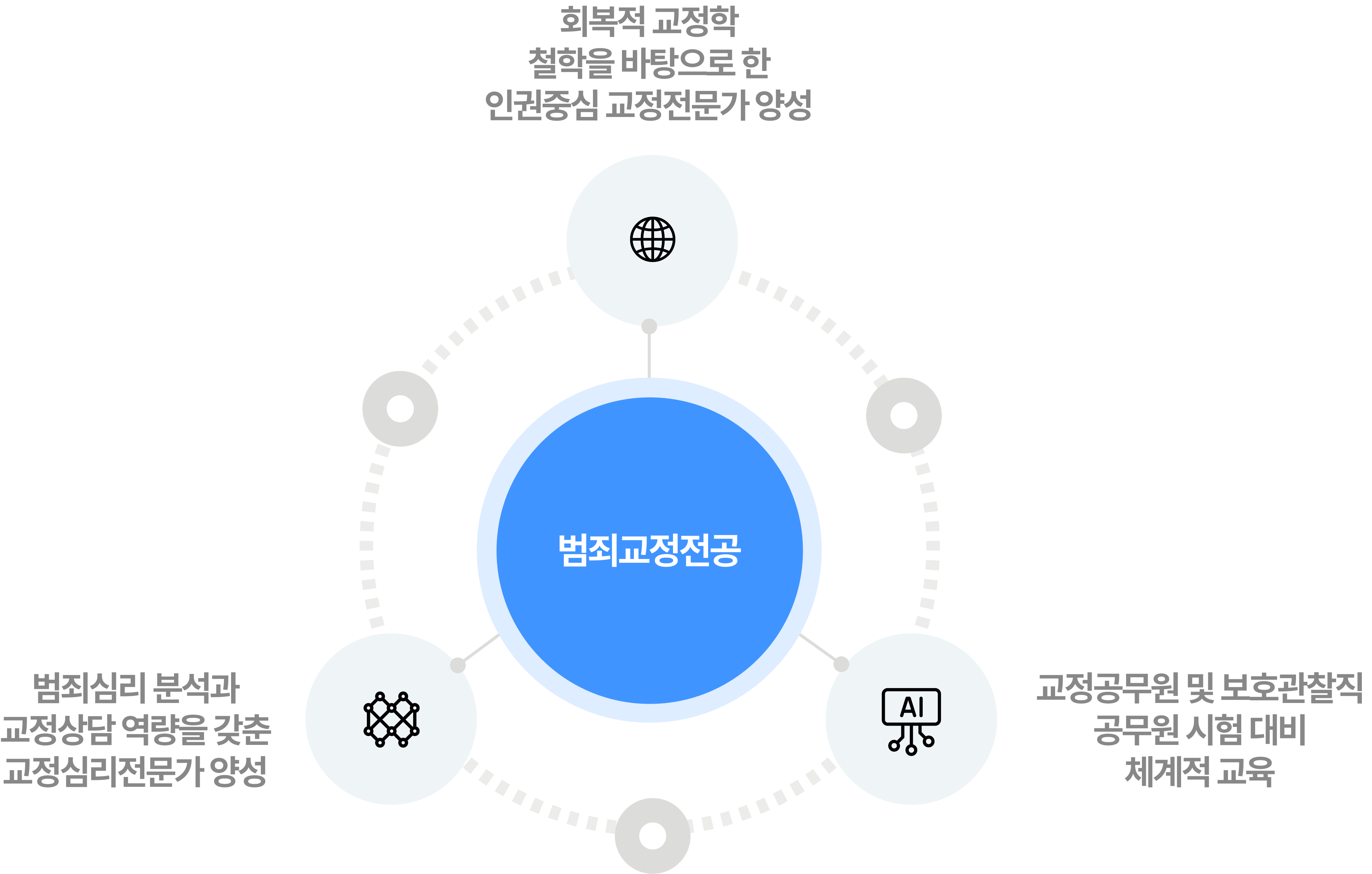 21세기 교정학의 새로운 패러다임인 회복적 교정(Restorative Justice)을 기반으로 범죄자의 사회복귀와 재활을 전문적으로 담당하는 교정전문가를 양성합니다. 처벌 중심에서 회복과 치료 중심으로의 교정철학 전환을 통해 인권을 존중하고 교정 효과를 극대화하는 전문 인력을 배출합니다. 교정공무원, 보호관찰직공무원 등 공익적 사명을 가진 교정 분야 전문가로서 안전한 사회 구현에 기여하는 인재를 양성하고 있습니다.