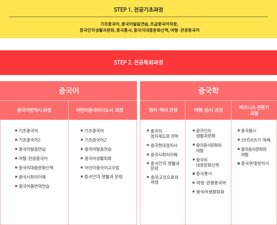 STEP 1. 전공기초과정 기초중국어, 중국학입문, 중국어발음연습, 중국어듣기연습, 초급중국어작문, 중국인의생활과문화, 중국에술과문학, 중국통사, 중국의대중문화산책, 여행·관광중국어 STEP 2. 전공특화과정